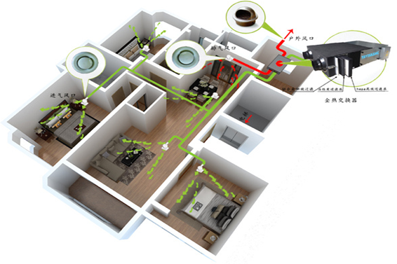 新風機組由送排風系統組成,送風系統包含新風管、新風閥、送風管、送風閥、送風機等,排風系統包含回風管、回風閥、排風管、排風閥、排風機等。新風機組包含兩個過濾段,分別是初效過濾段和中效過濾段,此外還包含新風和排風的換熱段。新風的傳輸方式采用置換的方式,室外的新鮮空氣經過初效和中效過濾網的過濾之后通過安裝在臥室等窗戶上的新風口送入房間內。同時,再通過相應的室內回風管與各個房間內的回風口連接,這樣便構成了一個循環,可以把室內的廢氣集中在排風口后排出,而室內排走的污染氣體將不會再進行循環利用,送風系統和排風系統在室內形成的氣流組織狀況良好。